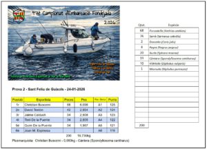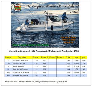 Ara tenim una pausa al Campionat d’Embarcació Fondejada fins al març (aprofitarem per eixugar-nos), on deixarem les aigües de la Costa Brava i ens embarcarem a la capital de la comarca del Garraf, però abans tindrem altres activitats en altres disciplines de pesca, començant pel 10è Concurs de les Espècies la setmana vinent a l’Àrea de Pesca del Port de Barcelona, així que fins llavors, Salut i bona pesca!!